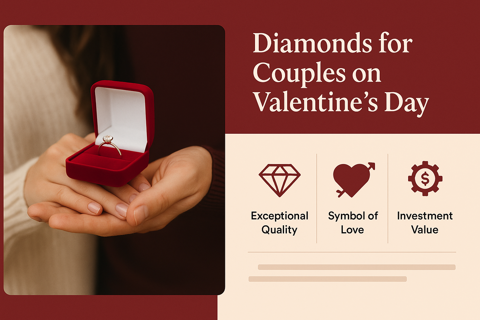 Engaging promotional image for Valentine's Day showcasing a diamond ring in a red box, emphasizing themes of love and quality. Ideal for jewelry marketing.