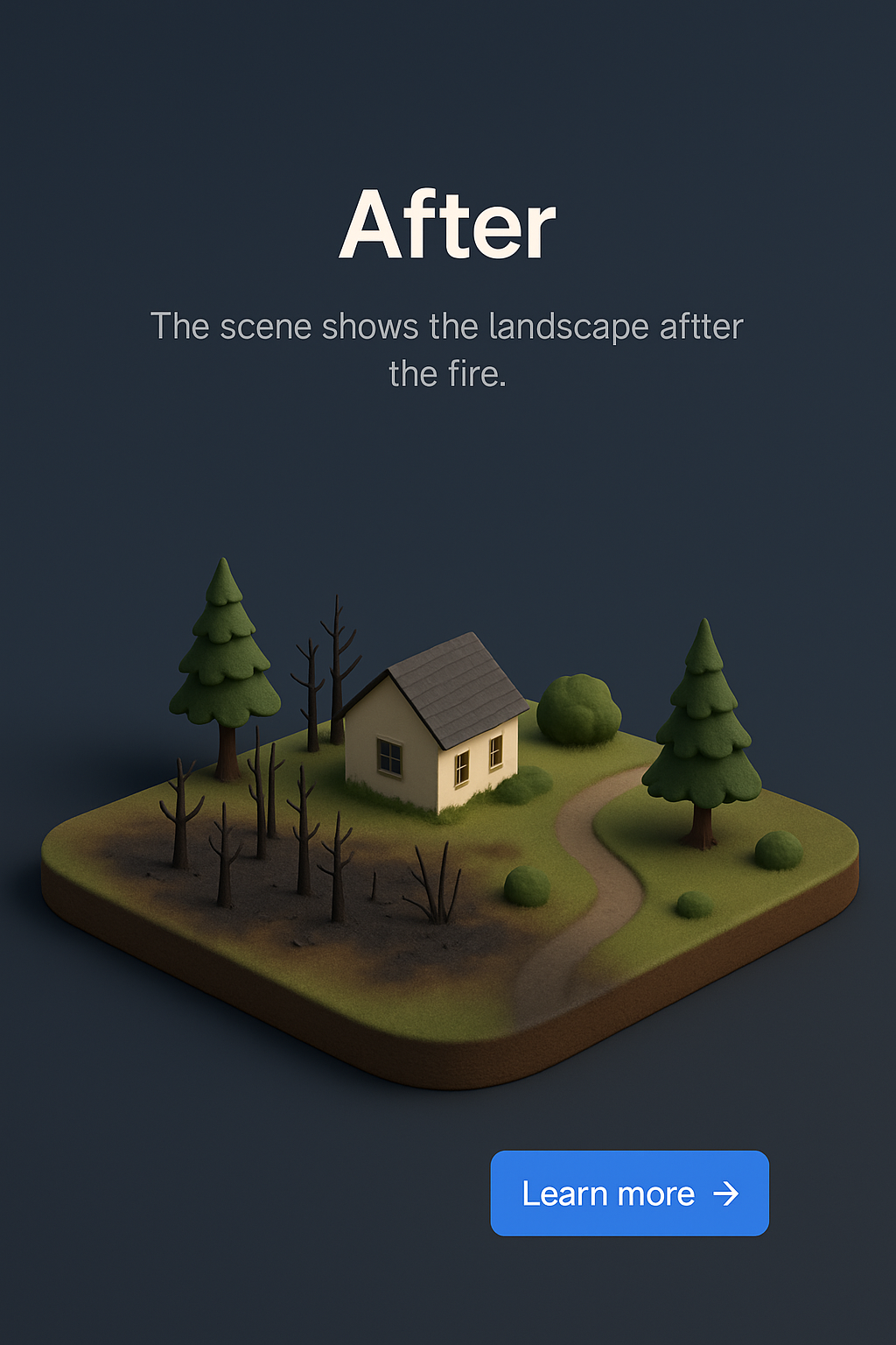 /Collection: /by davooda/Type: PNG/A 3D representation of a landscape showing a house and trees in a post-fire environment. The dark background enhances the vividness of the scene, which includes burnt trees and a winding path.