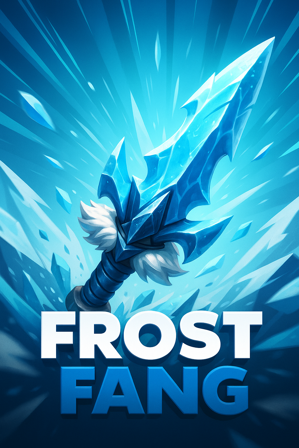 /Collection: /by davooda/Type: PNG/A captivating 3D illustration of a frost fang sword, with icy sharp edges and dynamic rays emanating from the center. The background features a smooth gradient transitioning to a solid blue color, enhancing the design's impact.