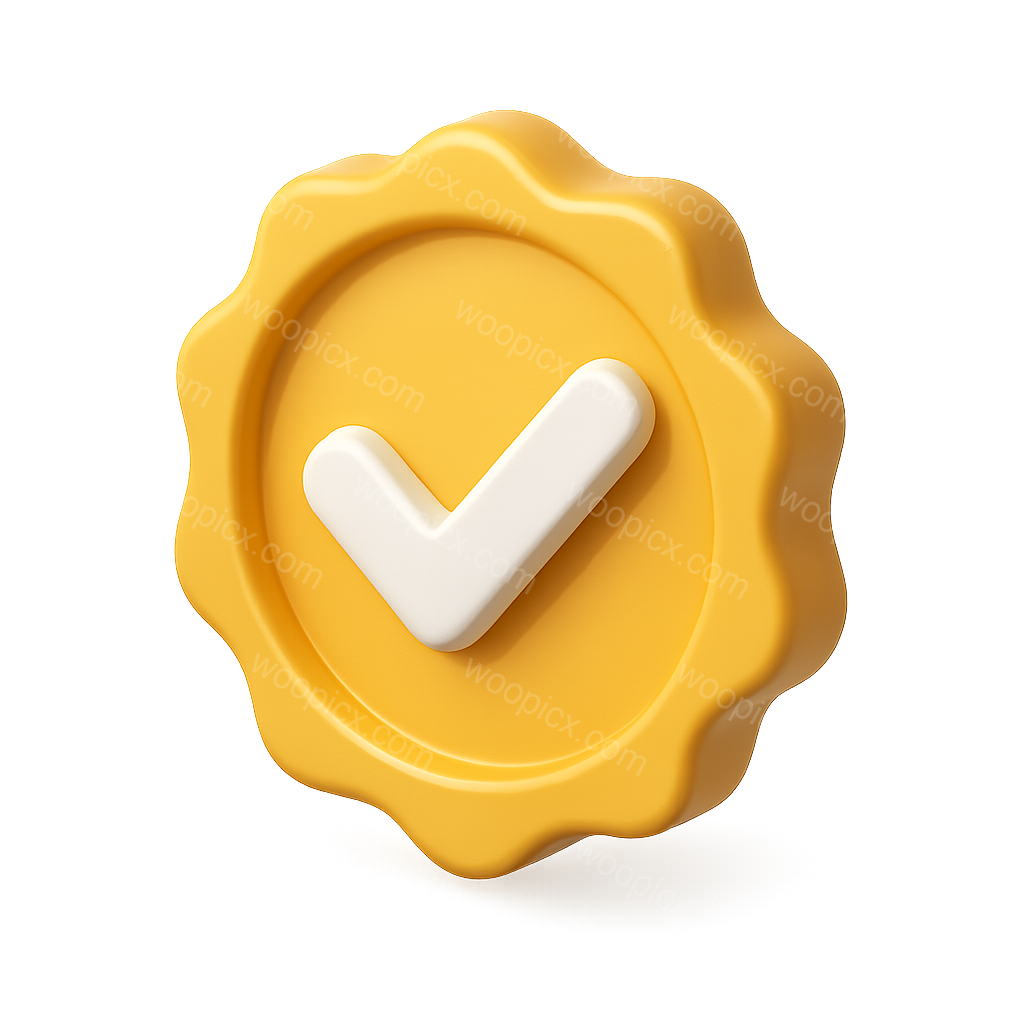 A three-dimensional checkmark badge features a glossy yellow circular design with a prominent white checkmark, rendered in an isometric view against a soft gradient background.