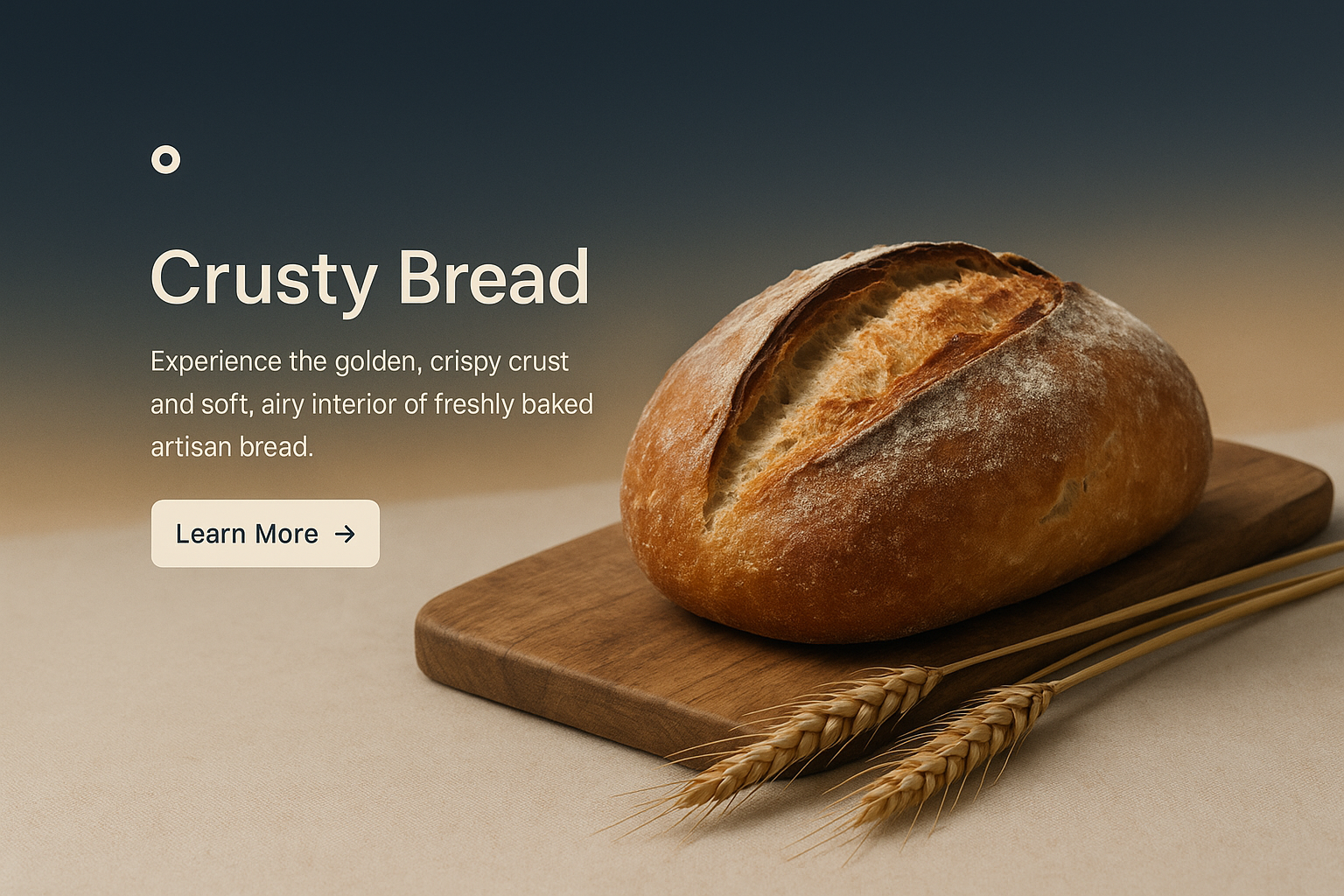 A stylish web page design showcasing a loaf of crusty artisan bread on a wooden board with wheat stalks. The design features a gradient background and clear call-to-action elements.