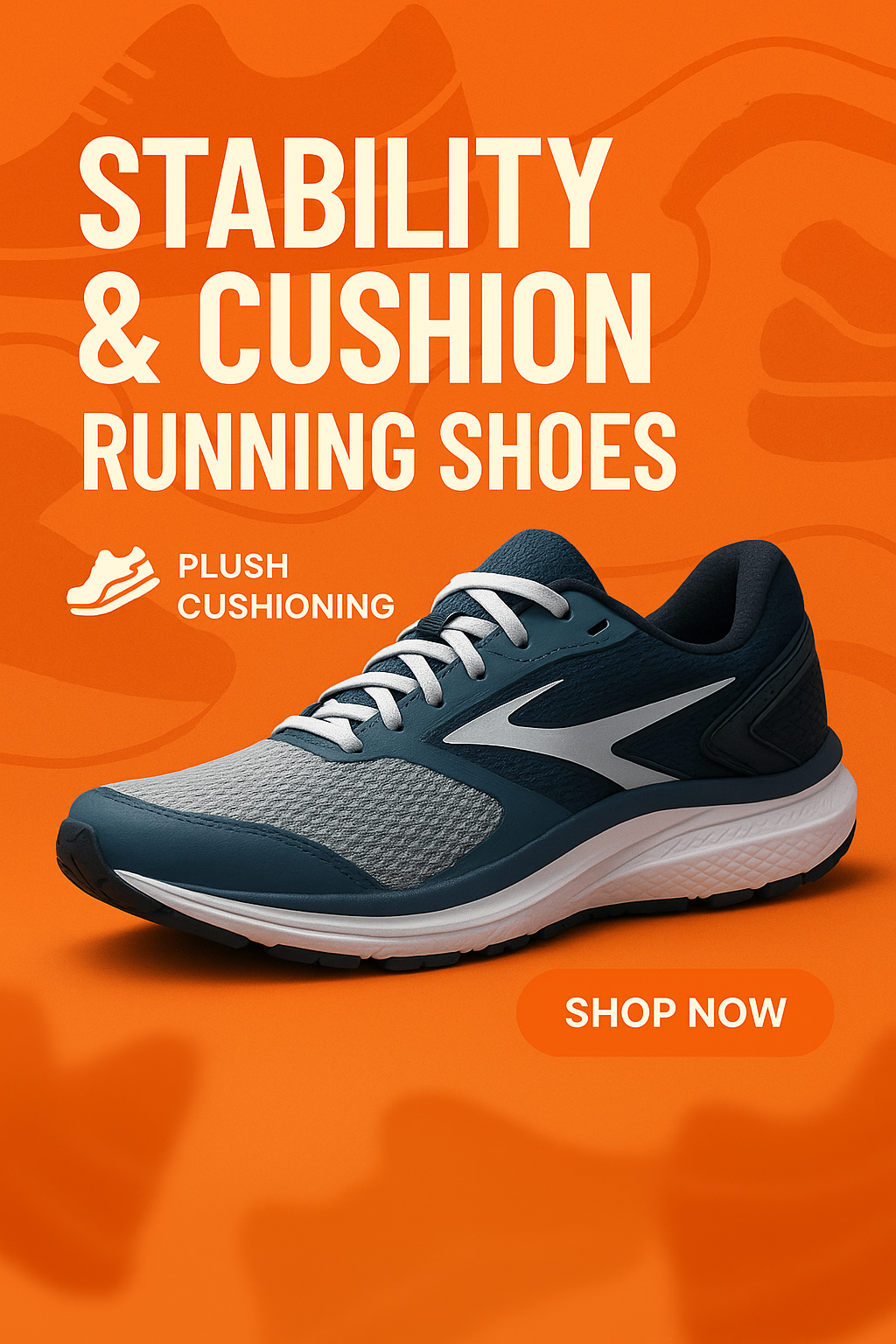 Promotional Banner for Running Shoes Featuring Stability and Cushioning