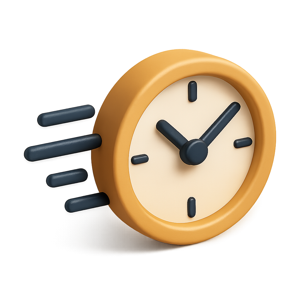 A stylized 3D clock icon featuring motion lines to indicate speed. The clock has a warm color palette with a three-quarter isometric view, showcasing its volumetric design.