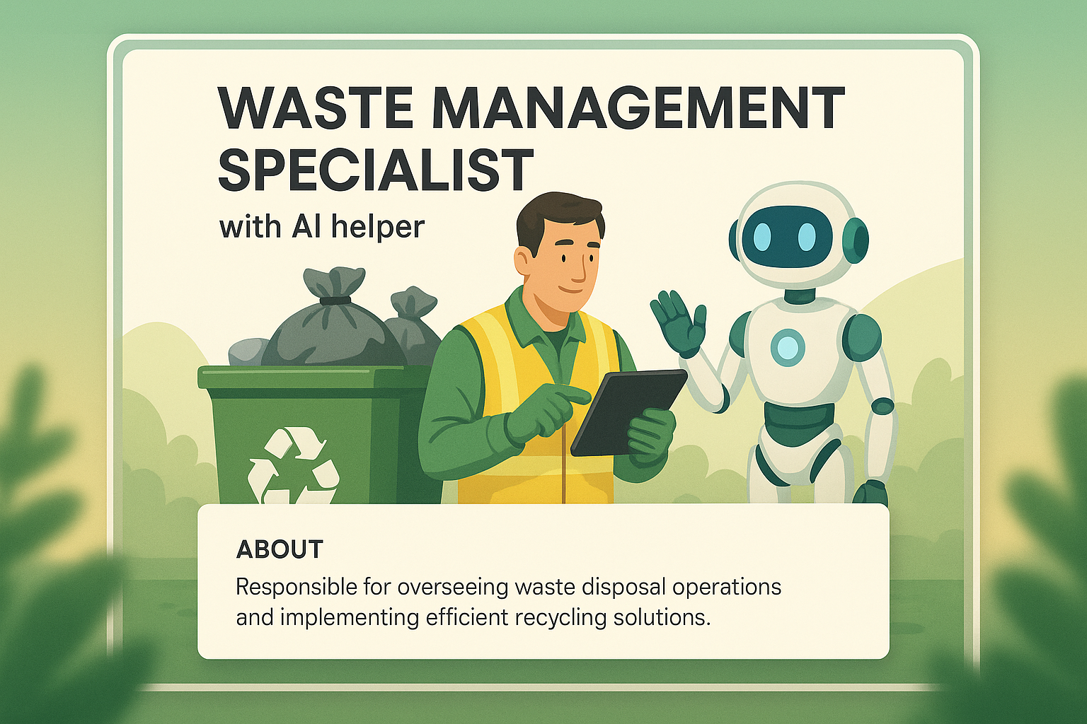 An illustrated scene featuring a waste management specialist with an AI robot helper. The background includes a gradient design, while the foreground displays a clear informative block detailing their roles.