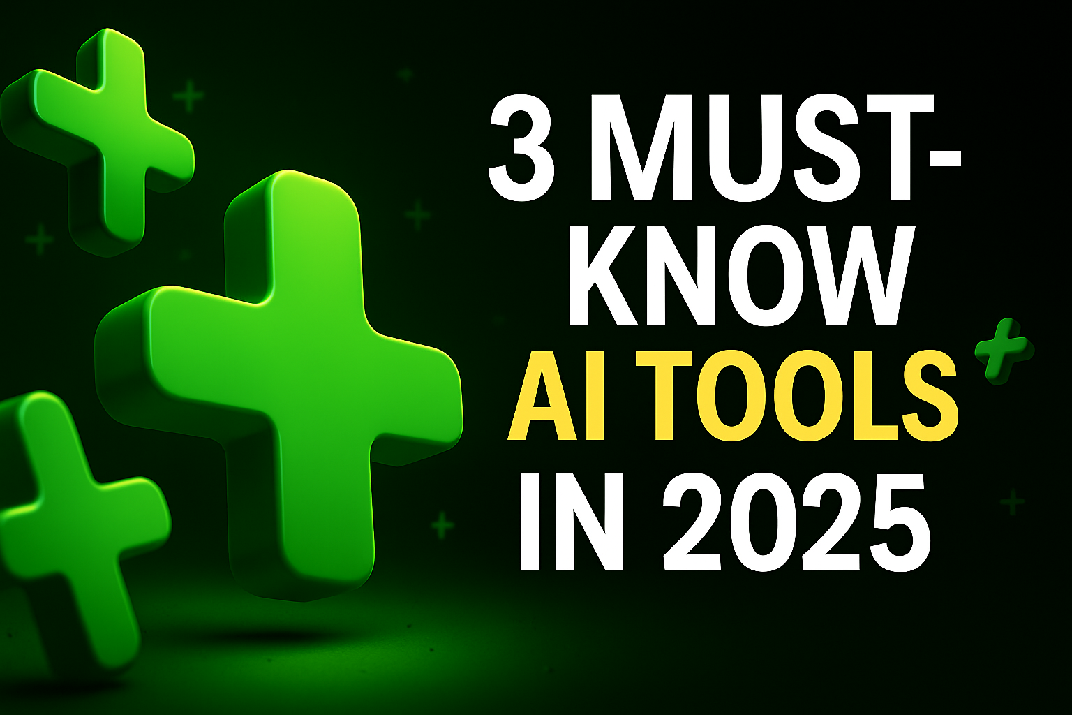A dynamic promotional graphic featuring bold typography and vibrant green elements, designed to highlight important AI tools for 2025, suitable for social media or blog use.