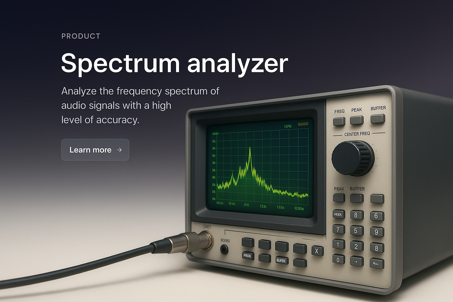 A sleek web design concept featuring a spectrum analyzer with a gradient background. The display shows frequency data, accompanied by a call-to-action button.
