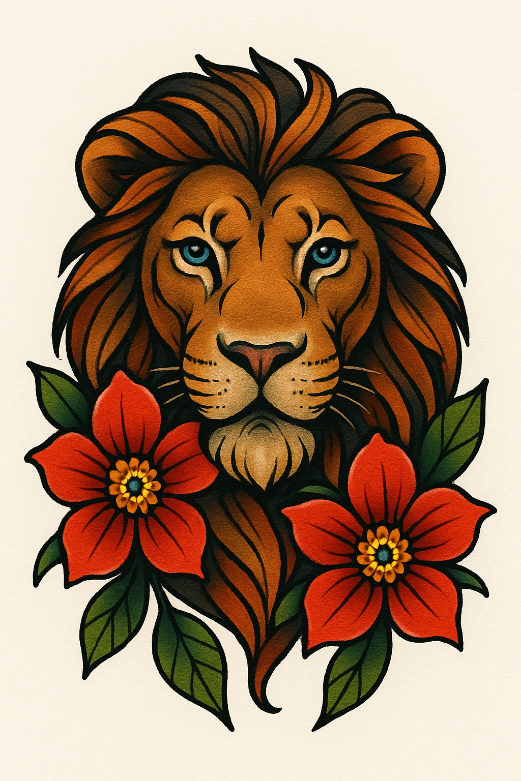 Detailed illustration of a lion's face surrounded by vibrant red flowers, showcasing bold lines and rich colors, ideal for art prints or tattoo designs.