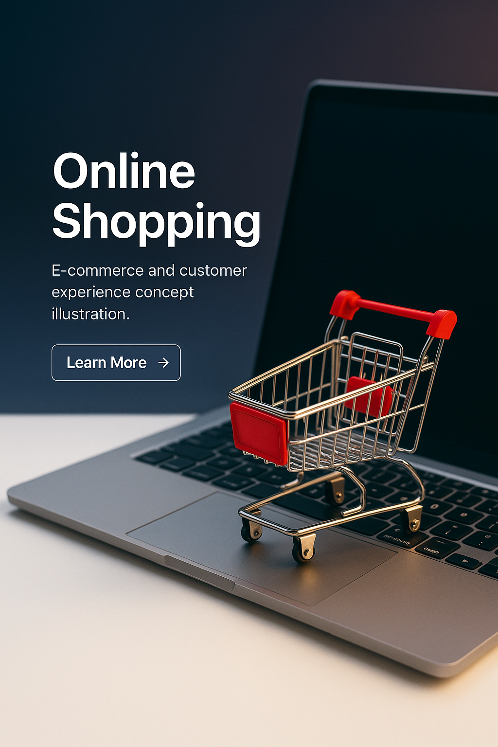 A sleek illustration depicting online shopping with a miniature shopping cart placed on a laptop keyboard, symbolizing the digital consumer experience.