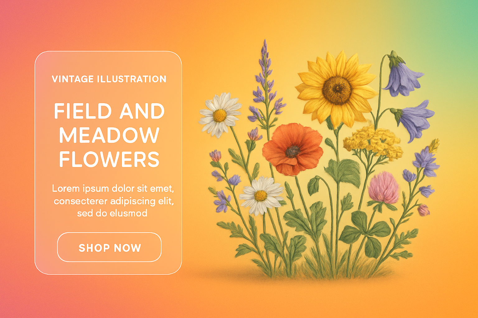 /Collection: /by davooda/Type: PNG/A vibrant and modern floral display featuring field and meadow flowers, designed in a vintage painting style. The background features a soft gradient that enhances the realism of the flowers.