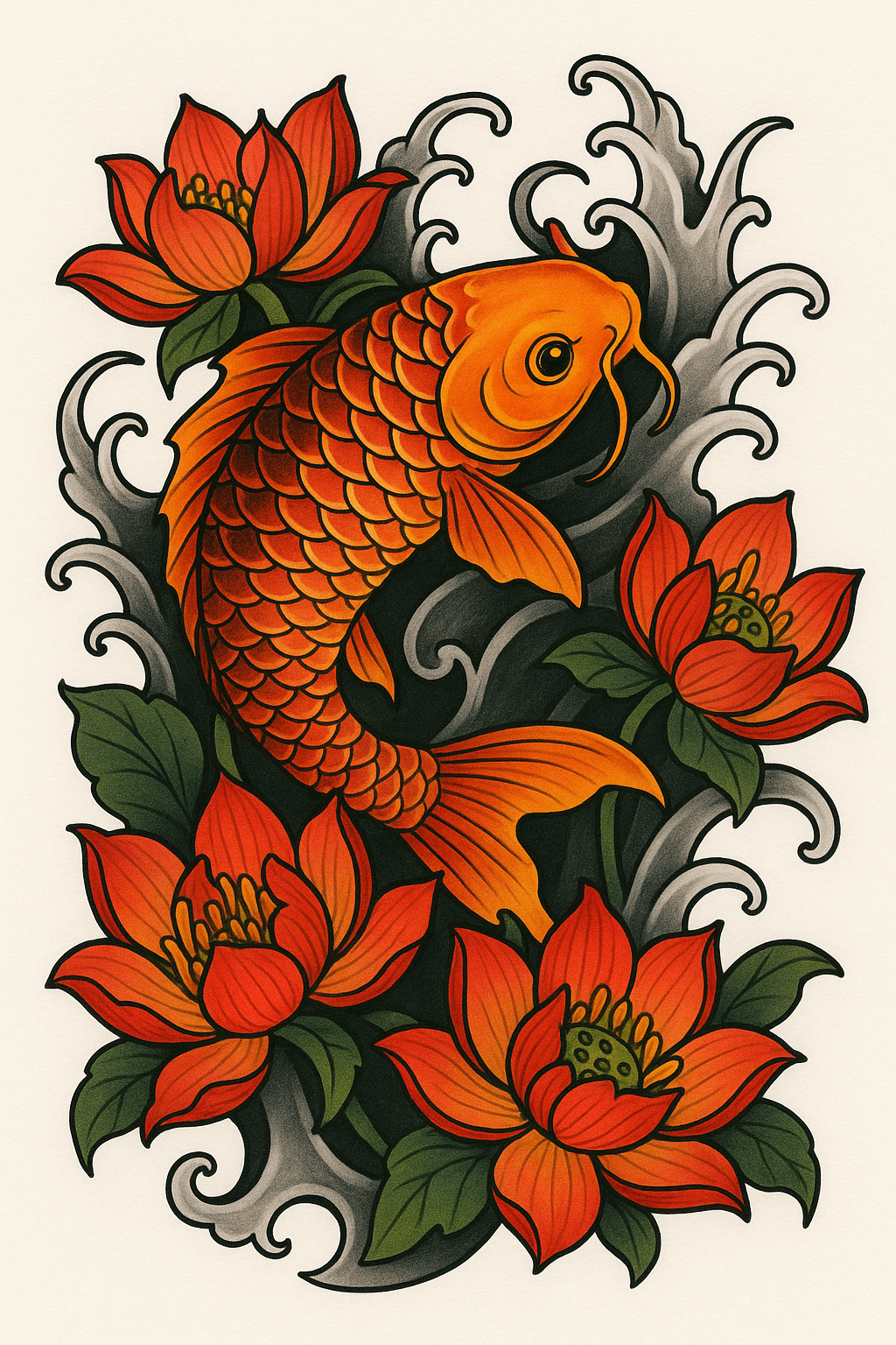Vibrant Koi Fish Illustration Surrounded by Lotus Flowers