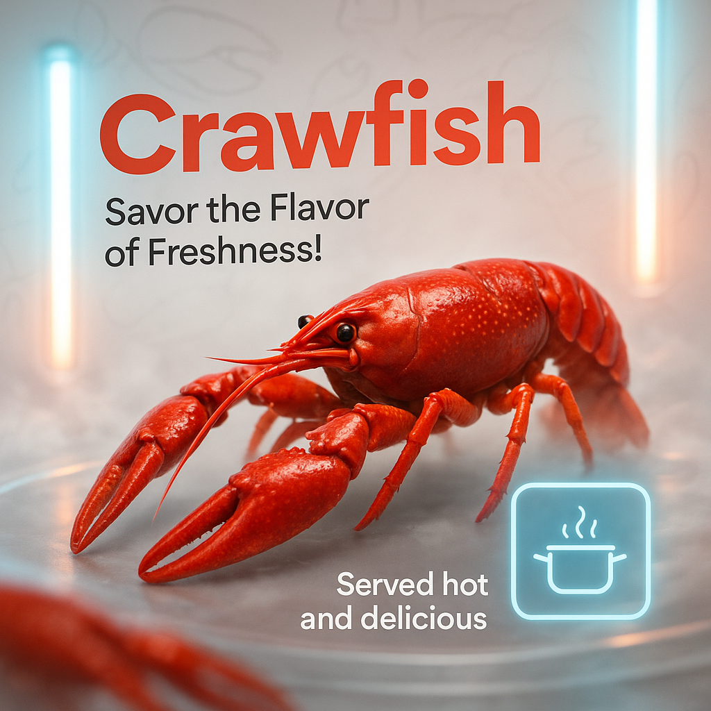 A realistic design showcasing a vibrant crawfish with engaging text. Features neon elements and a layered composition, emphasizing freshness and flavor.