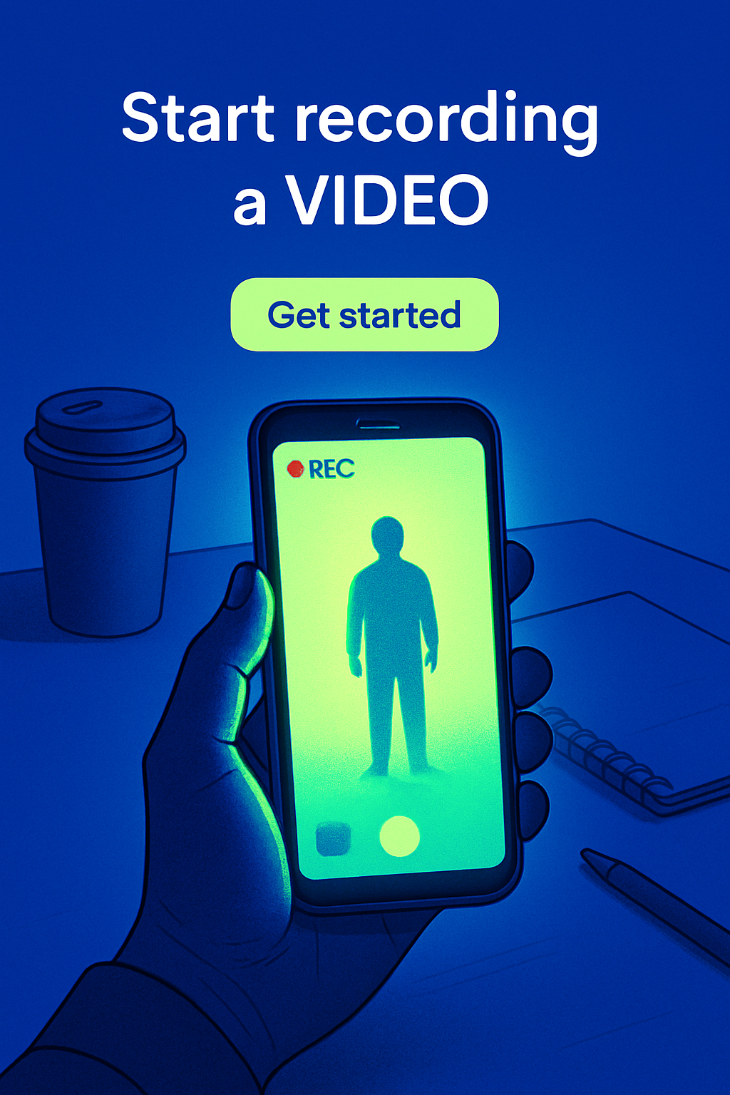 A hand holds a phone displaying a glowing figure while recording a video. The scene is bathed in light yellow-green and solid blue hues, creating a striking contrast.
