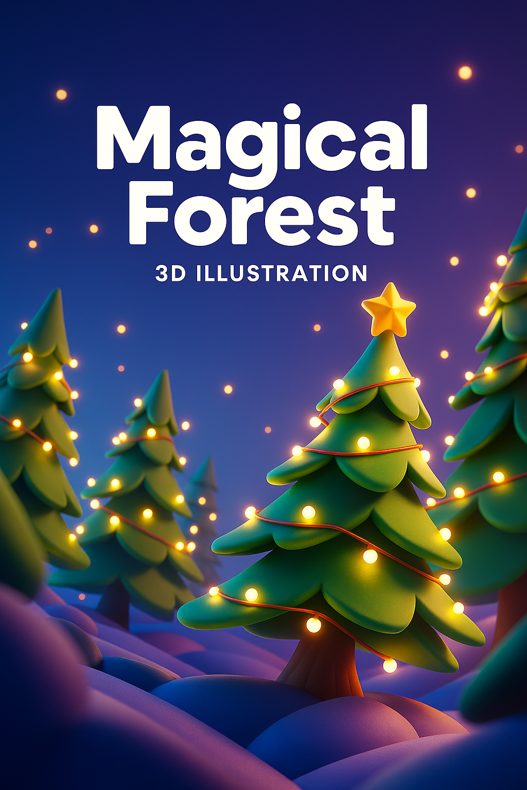 A vibrant 3D illustration of a magical forest featuring Christmas trees adorned with glowing lights. The scene captures a dynamic atmosphere with a smooth gradient background.