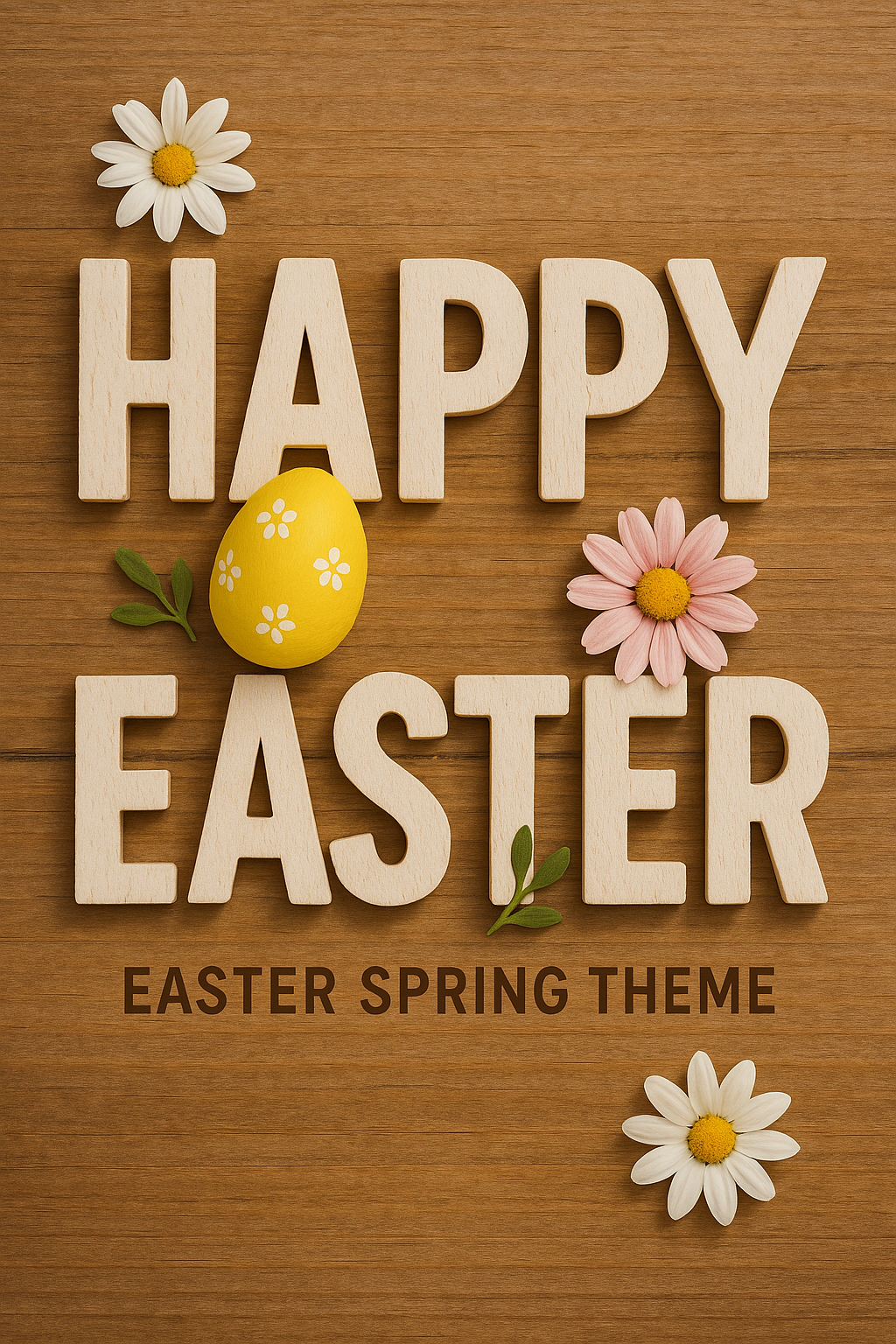 Festive Easter-themed graphic featuring wooden letters, floral elements, and a decorative egg, ideal for seasonal promotions or greetings.