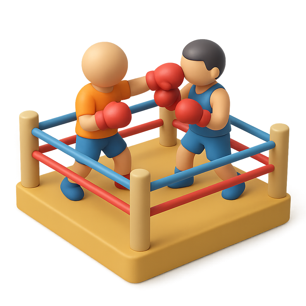 A vibrant 3D illustration of two boxers engaging in a match within a colorful ring. The figures are stylized with a playful aesthetic, featuring a transparent background and a three-quarter view.