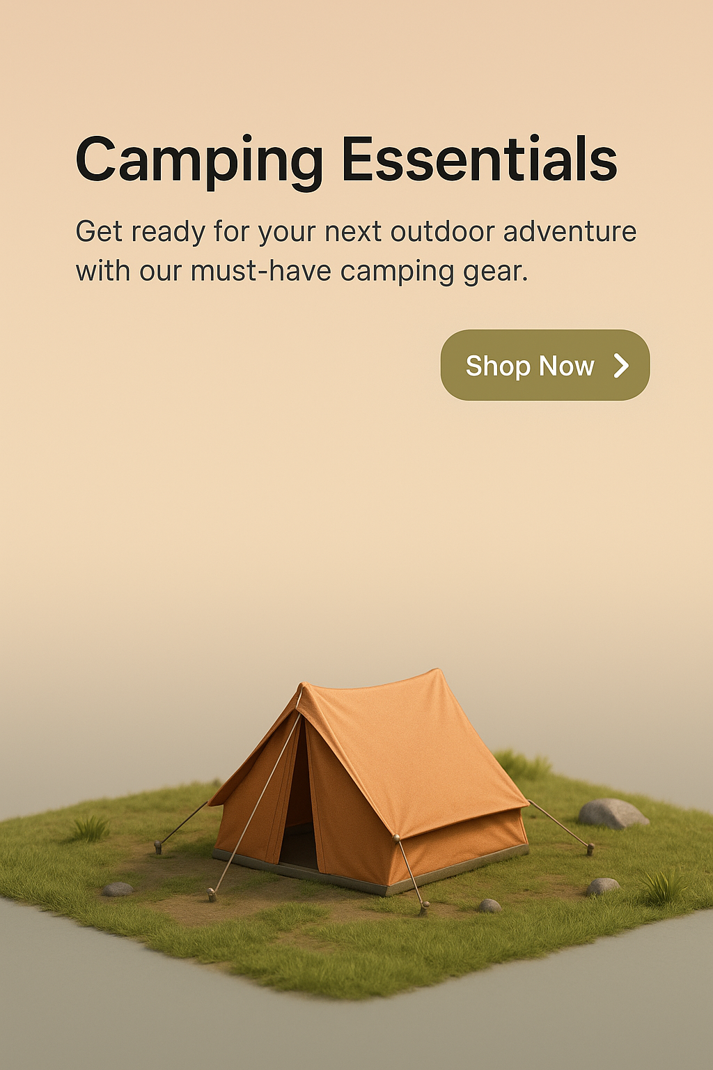 /Collection: /by davooda/Type: PNG/A detailed 3D illustration of a camping tent set in a minimalist outdoor environment. The scene features a soft gradient background and a clear call-to-action button.