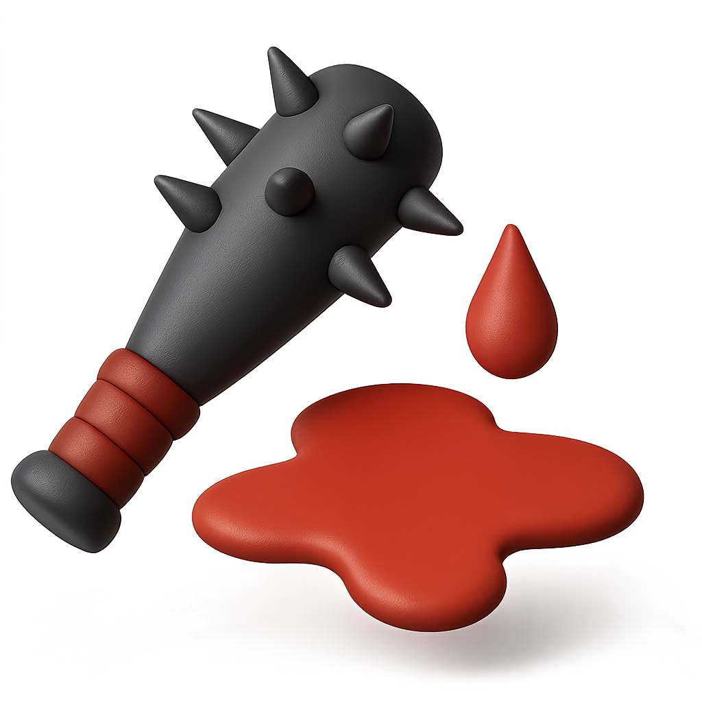 A visually striking 3D icon featuring a spiked bat alongside red blood droplets and a splatter, designed with a transparent background and an isometric viewpoint.