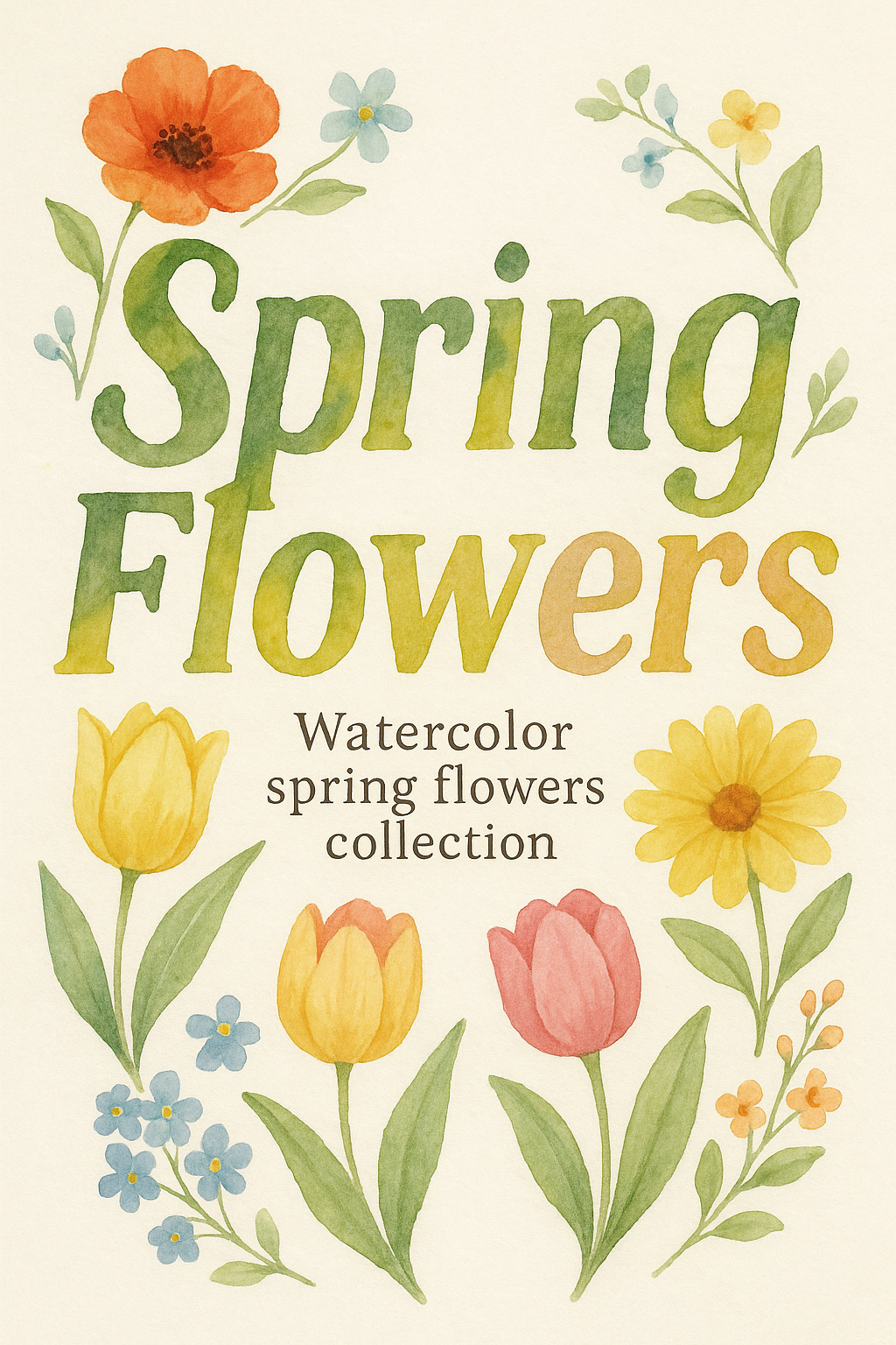 Charming watercolor illustration featuring a collection of spring flowers with vibrant colors and playful design. Ideal for seasonal promotions or floral-themed projects.