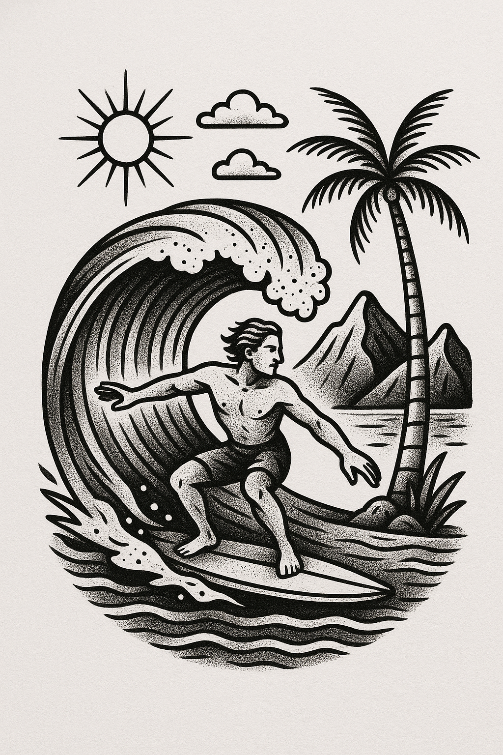 /Collection: /by davooda/Type: PNG/This image features a black and white illustration of a surfer riding a wave, surrounded by palm trees and mountains. It captures a vintage aesthetic suitable for beach-themed decor.