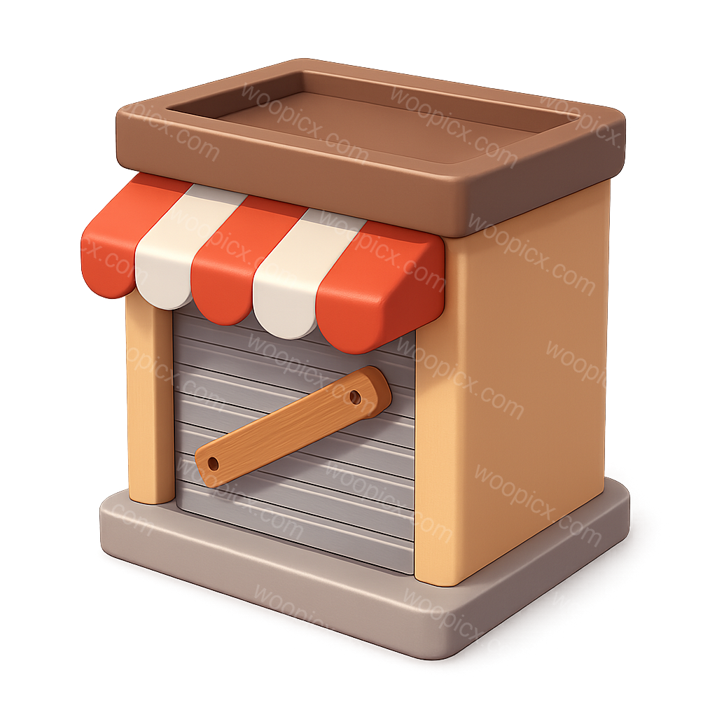 A stylized 3D representation of a closed shop, featuring a striped awning and a wooden lock. The design is isometric with a volumetric feel, set against a soft gradient background.