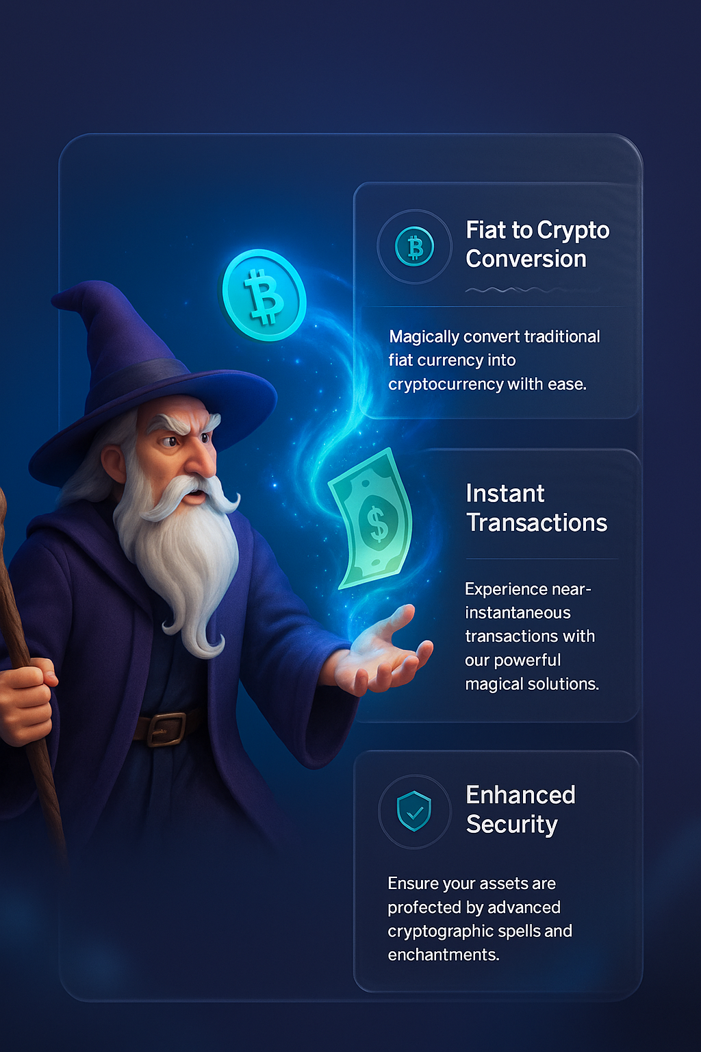 /Collection: /by davooda/Type: PNG/A wizard casting a spell to convert fiat currency into cryptocurrency, featuring an engaging background with gradient colors and informative text blocks on financial features.