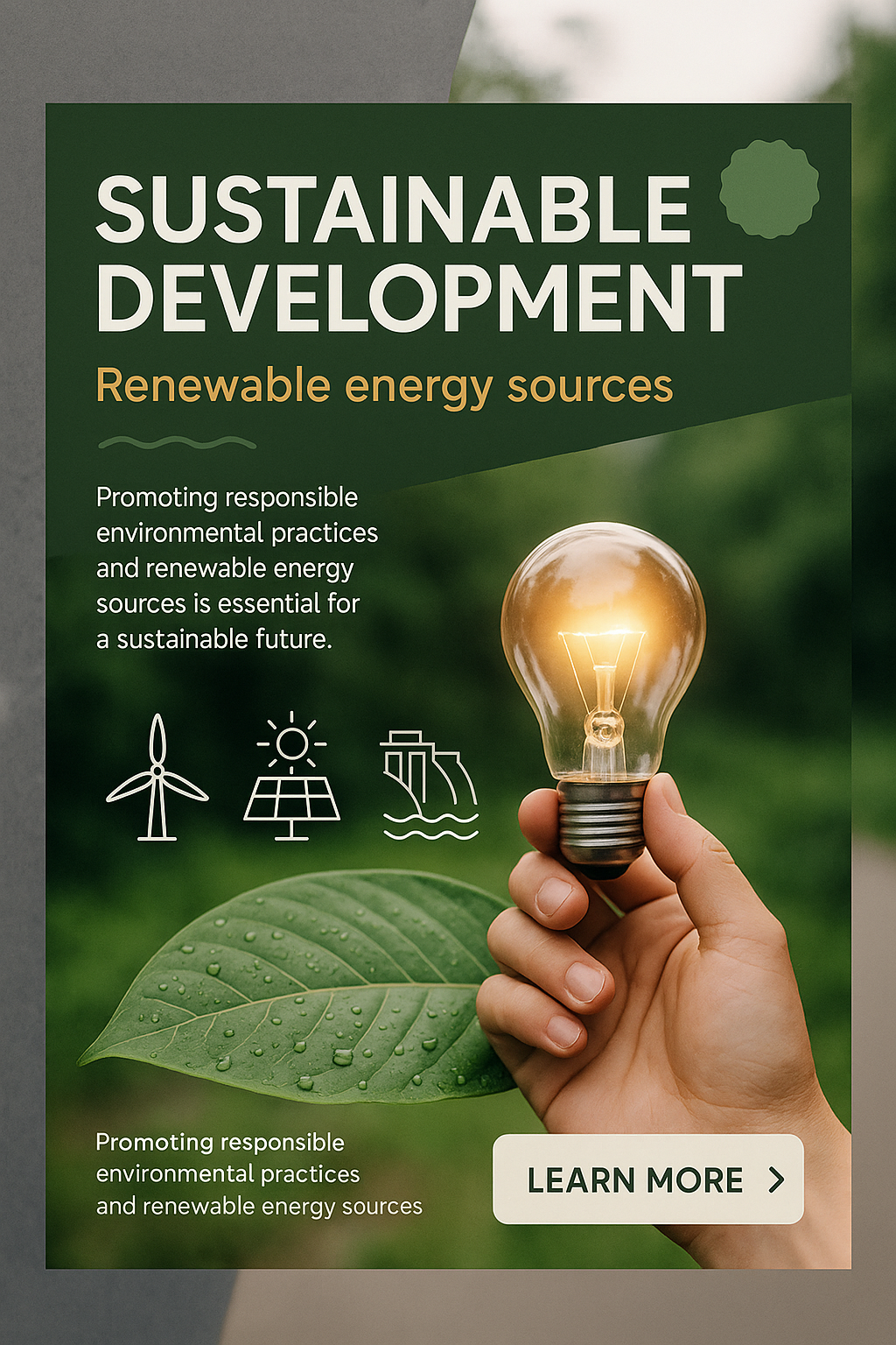 /Collection: /by davooda/Type: PNG/A hand holding a glowing light bulb against a green leaf backdrop, symbolizing sustainable energy. The design features elements of renewable sources, promoting eco-friendly practices.