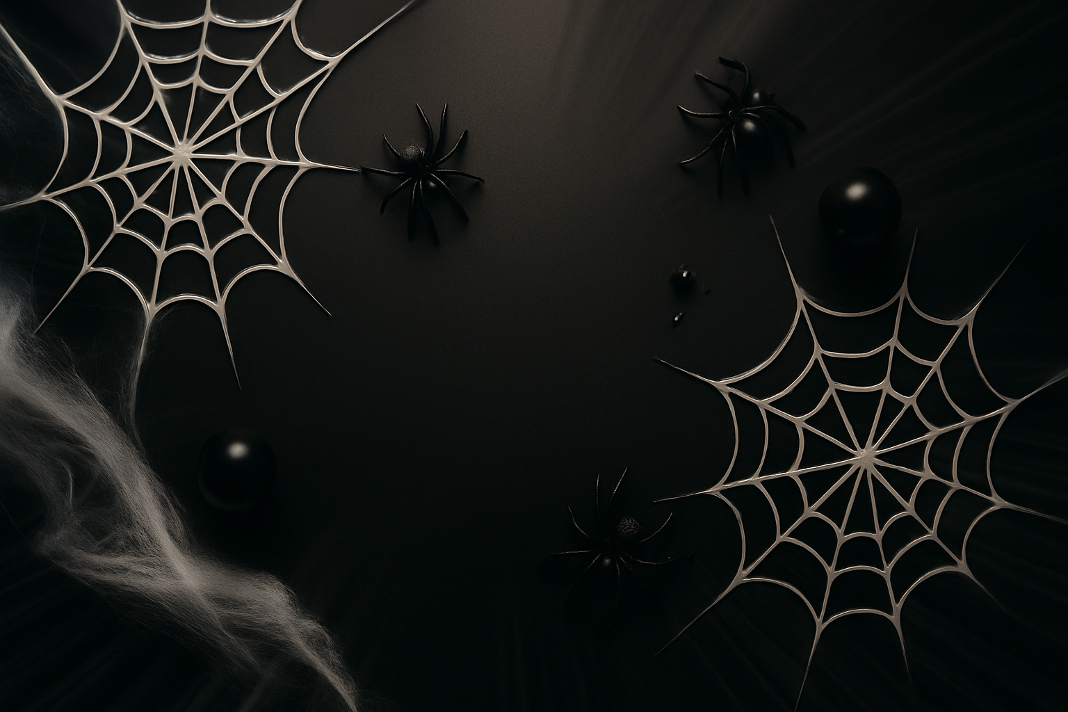 A captivating top view of a Halloween-themed flat lay featuring realistic spiders and intricate spider webs on a smooth black background, creating a spooky yet engaging atmosphere.