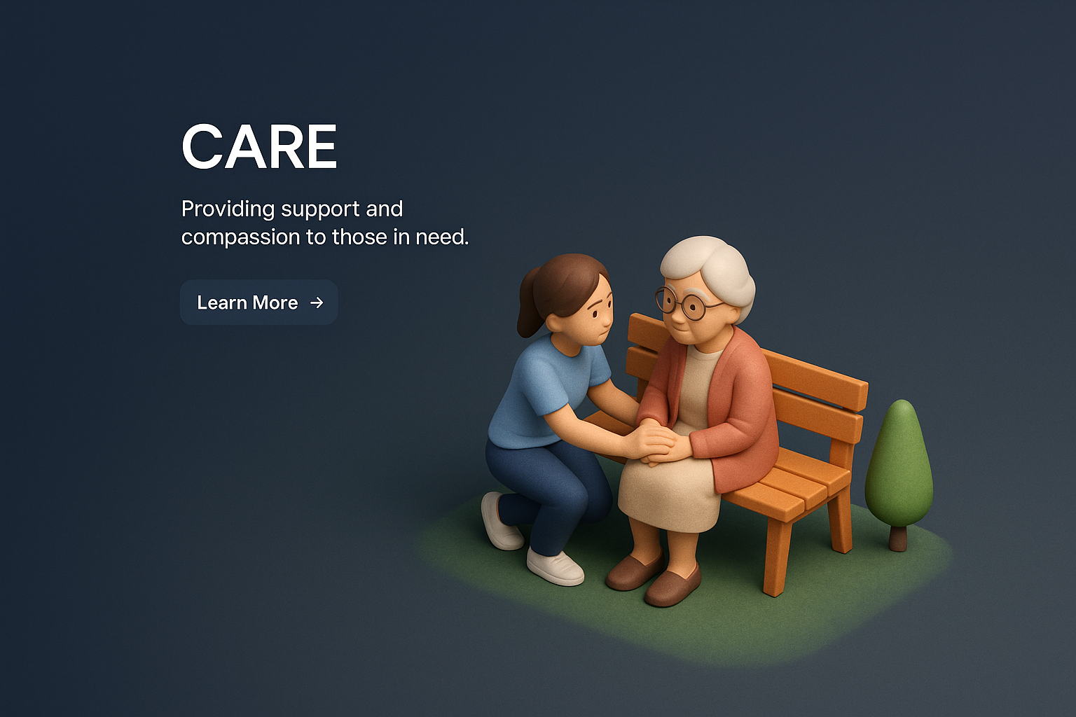 /Collection: /by davooda/Type: PNG/A detailed 3D scene illustrating a caring interaction between a woman and an elderly lady on a bench, set against a smooth dark gradient background. The scene emphasizes compassion.