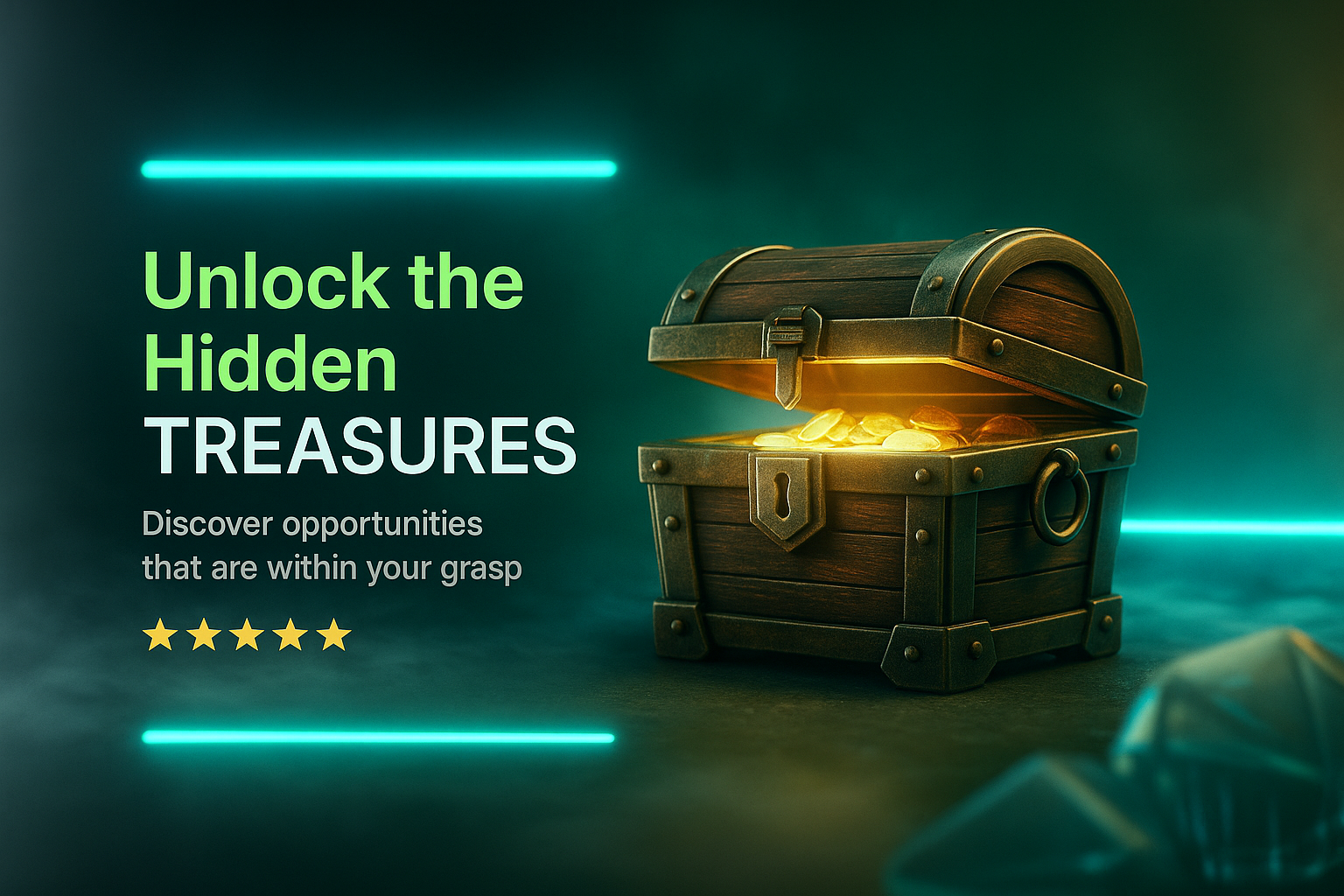 A captivating treasure chest glowing with golden coins, surrounded by neon accents and fog. The design features bold text inviting viewers to discover hidden opportunities.