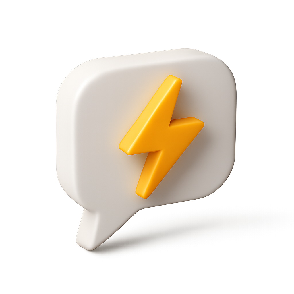 /Collection: /by davooda/Type: PNG/A visually striking 3D icon featuring a lightning bolt within a speech bubble, showcasing a transparent background and a three-quarter isometric view. The lightning bolt is bright yellow, contrasting against the white speech bubble.