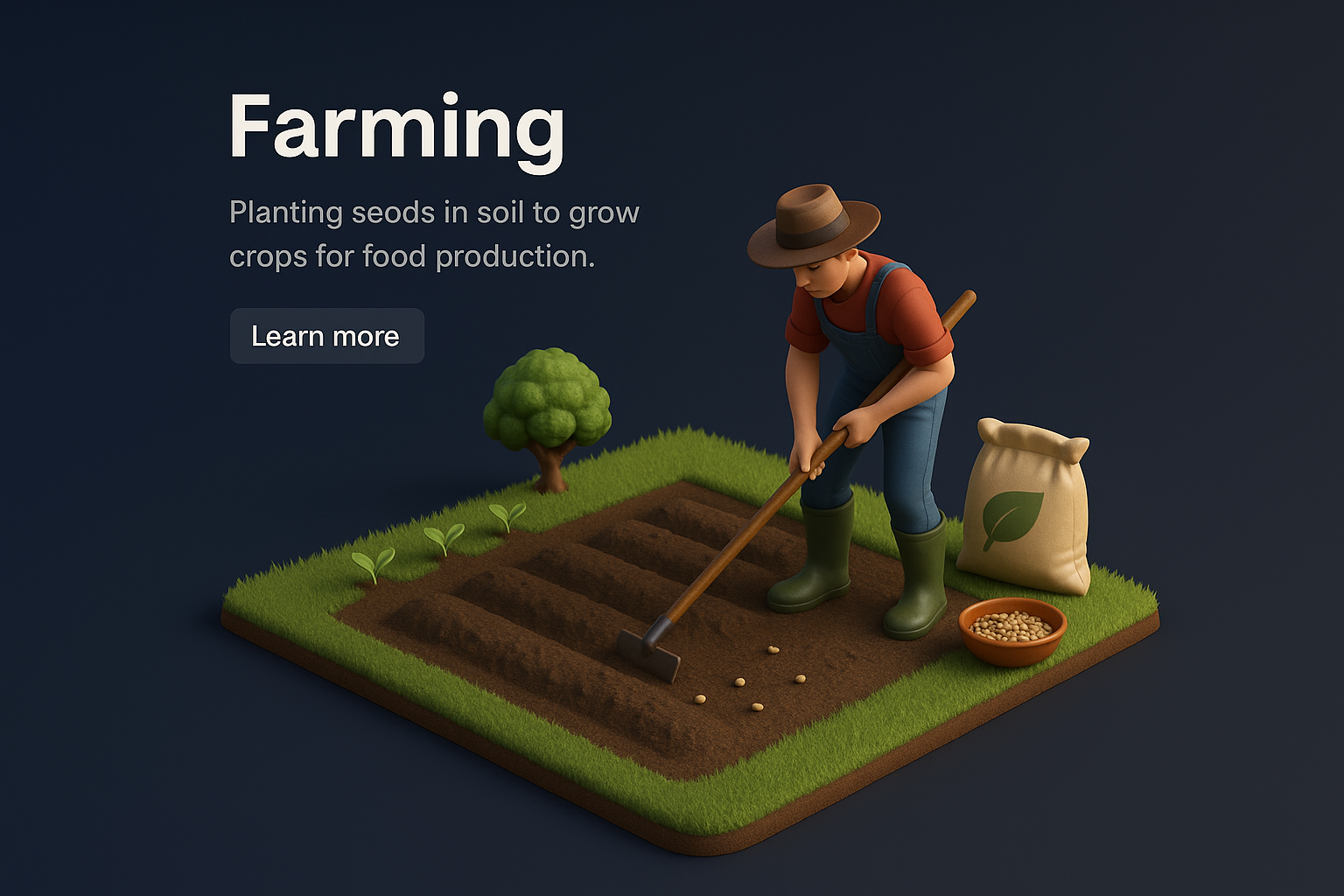 A detailed 3D illustration depicting a farmer planting seeds in soil, surrounded by crops and a tree. The dark gradient background enhances the vibrant scene.