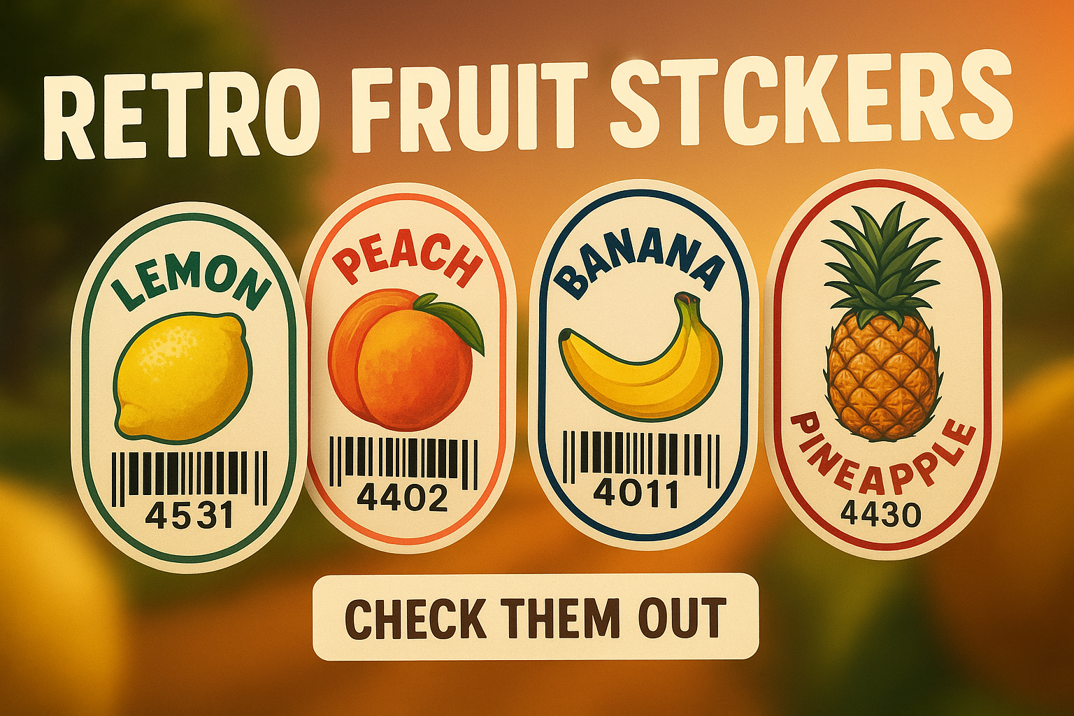 A vibrant graphic showcasing a collection of retro fruit stickers, featuring lemon, peach, banana, and pineapple designs with barcodes. Ideal for food-related projects or retro-themed marketing.