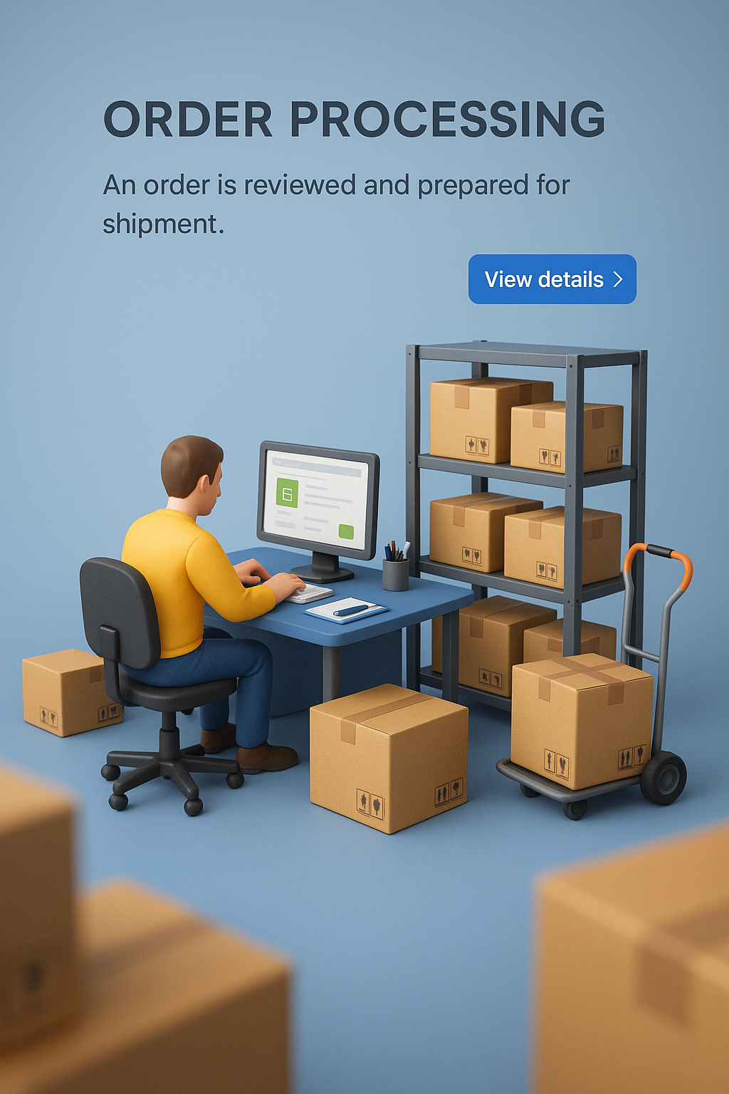 /Collection: /by davooda/Type: PNG/A detailed 3D illustration depicting order processing. A person reviews orders at a desk with a computer, surrounded by stacked boxes and a cart, conveying a busy shipping environment.
