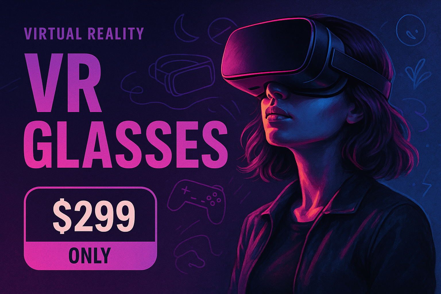 A captivating digital art illustration featuring a woman in VR glasses against a neon space backdrop. The design includes bold typography and a price tag, creating a striking advertisement.