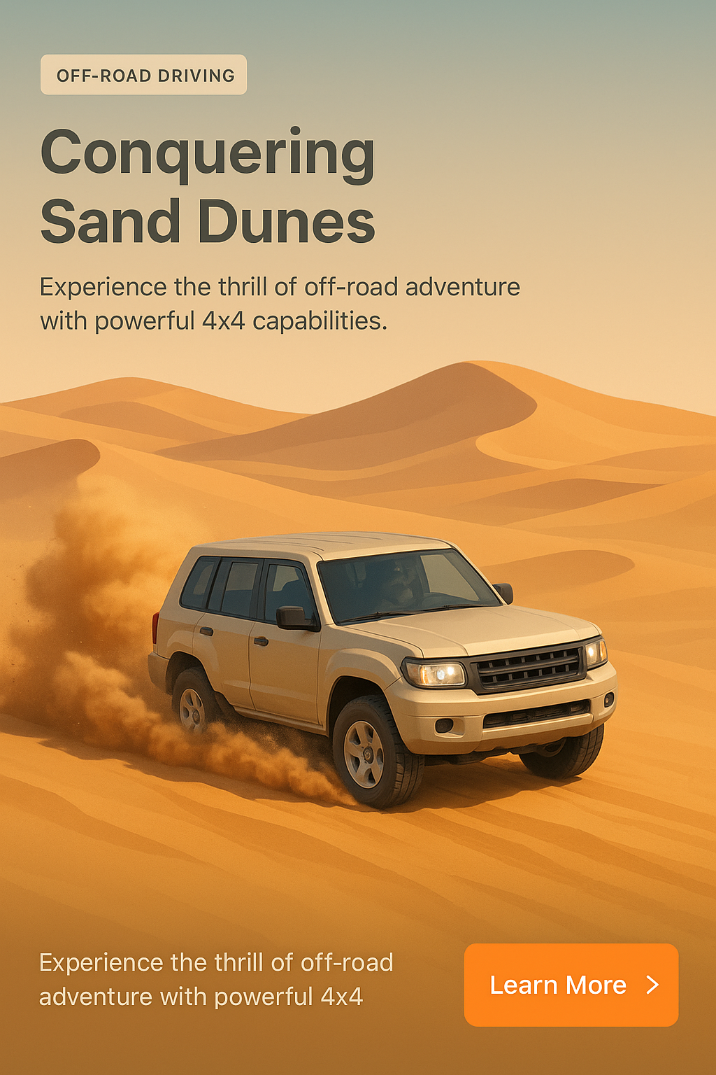 A realistic 3D illustration of a 4x4 SUV navigating through sand dunes in a vast desert landscape. The scene captures the thrill and excitement of off-road driving.