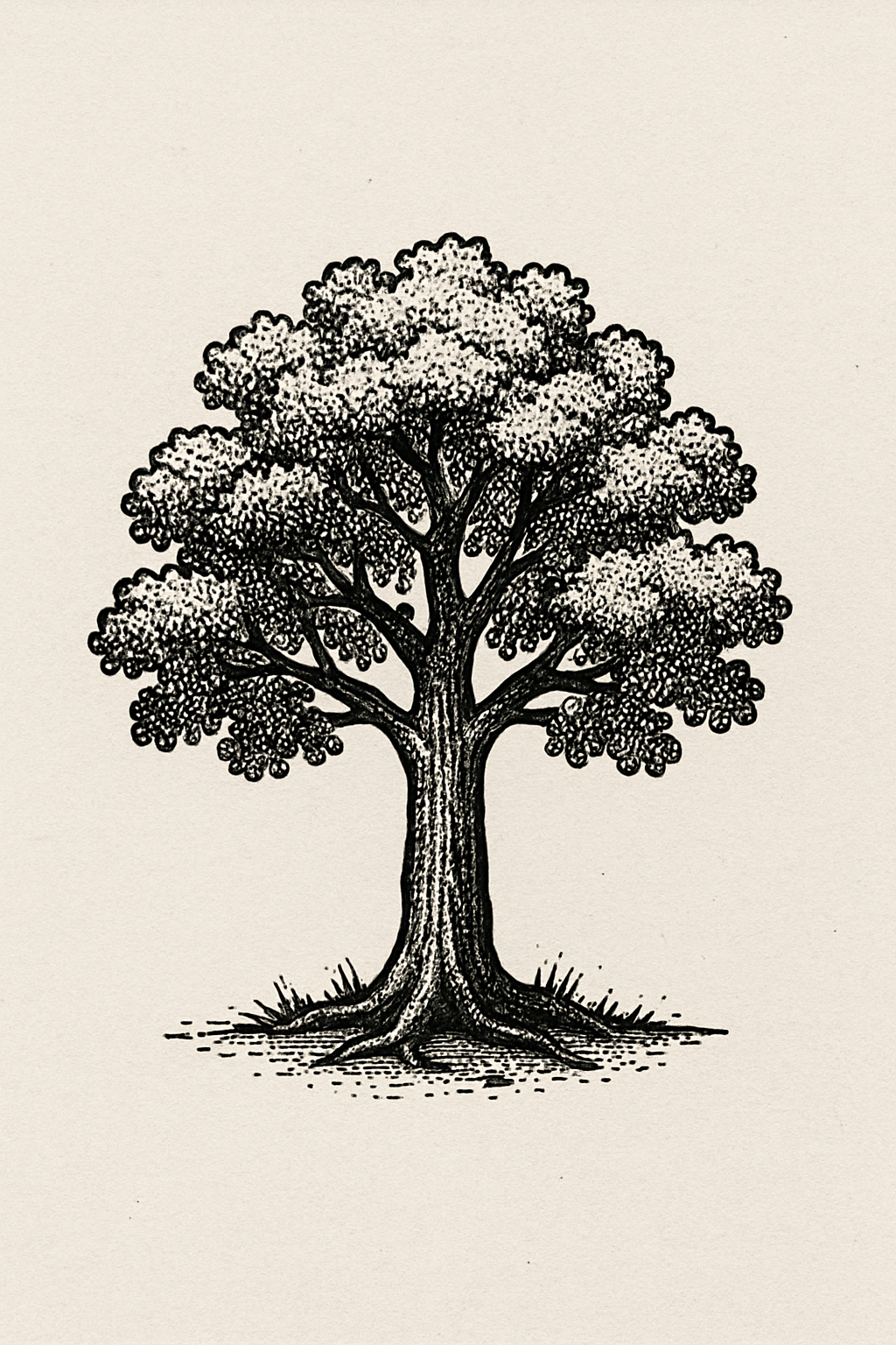 A vintage-style illustration of a tree, featuring intricate details and shading. Ideal for nature-themed projects, print materials, or decorative purposes.