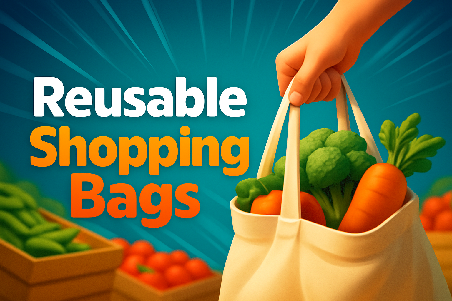 /Collection: /by davooda/Type: PNG/A vibrant close-up of a hand holding a reusable shopping bag filled with fresh vegetables, set against a lively farmers market background. The composition features dynamic lines and a colorful aesthetic.