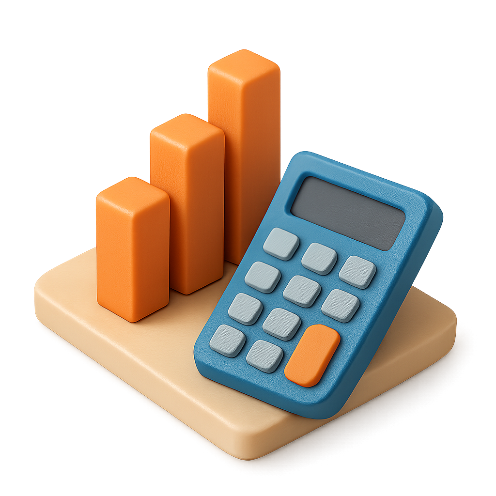 This image features a 3D icon depicting a calculator next to three ascending orange bar graphs, all set on a light base. The design has a volumetric and isometric feel.