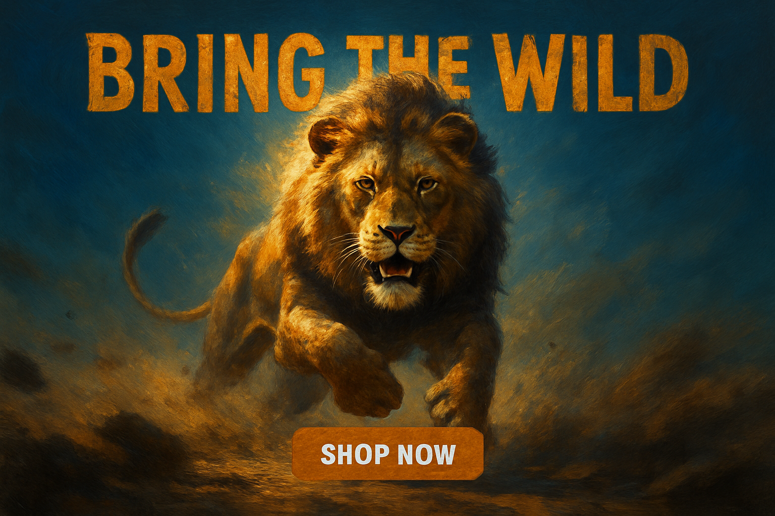 Dynamic lion imagery promoting wildlife-themed merchandise