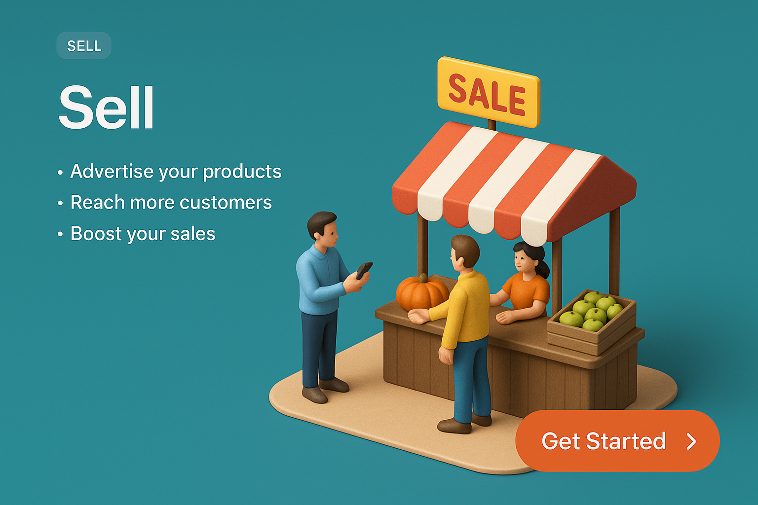 A vibrant 3D illustration depicting a market scene where small figures engage in selling products. The setting features a colorful stall with a 'SALE' sign, surrounded by fruits, creating an inviting atmosphere.