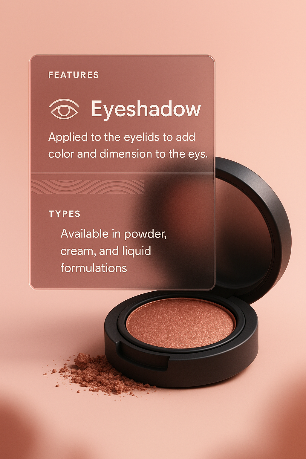 /Collection: /by davooda/Type: PNG/A sleek 3D illustration featuring an eyeshadow compact with a transparent overlay highlighting key features and types. The design includes soft colors and a polished look.
