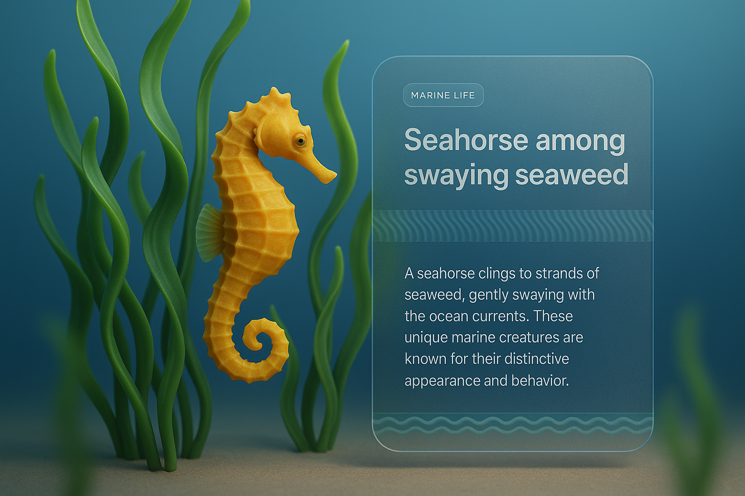 A vibrant 3D illustration featuring a seahorse amidst swaying strands of seaweed, set against a smooth gradient background. The scene captures the essence of marine life with a clean, cohesive design.