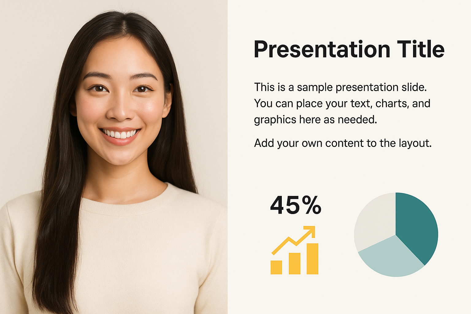 /Collection: /by davooda/Type: PNG/A clean and modern presentation slide featuring a friendly portrait, data charts, and placeholders for text. Ideal for business or educational presentations.