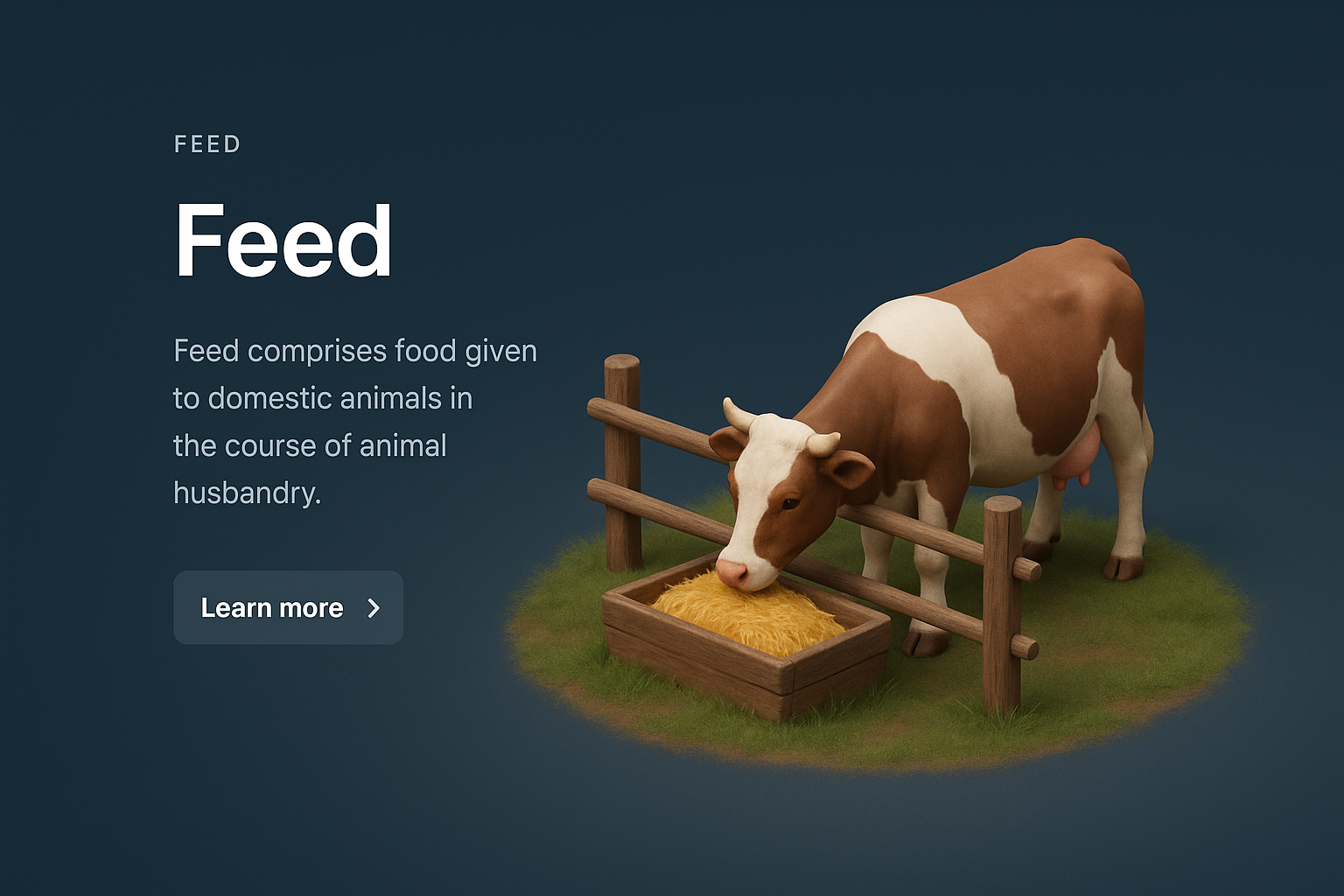 /Collection: /by davooda/Type: PNG/A 3D illustration depicting a cow at a feeding trough in a dark gradient background. The scene is zoomed out, showcasing the surroundings and providing a realistic representation of animal husbandry.