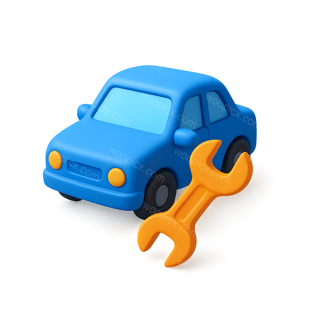 A vibrant 3D icon featuring a blue car alongside an orange wrench. The design showcases a three-quarter view with a smooth, volumetric appearance, set against a subtle gradient background.