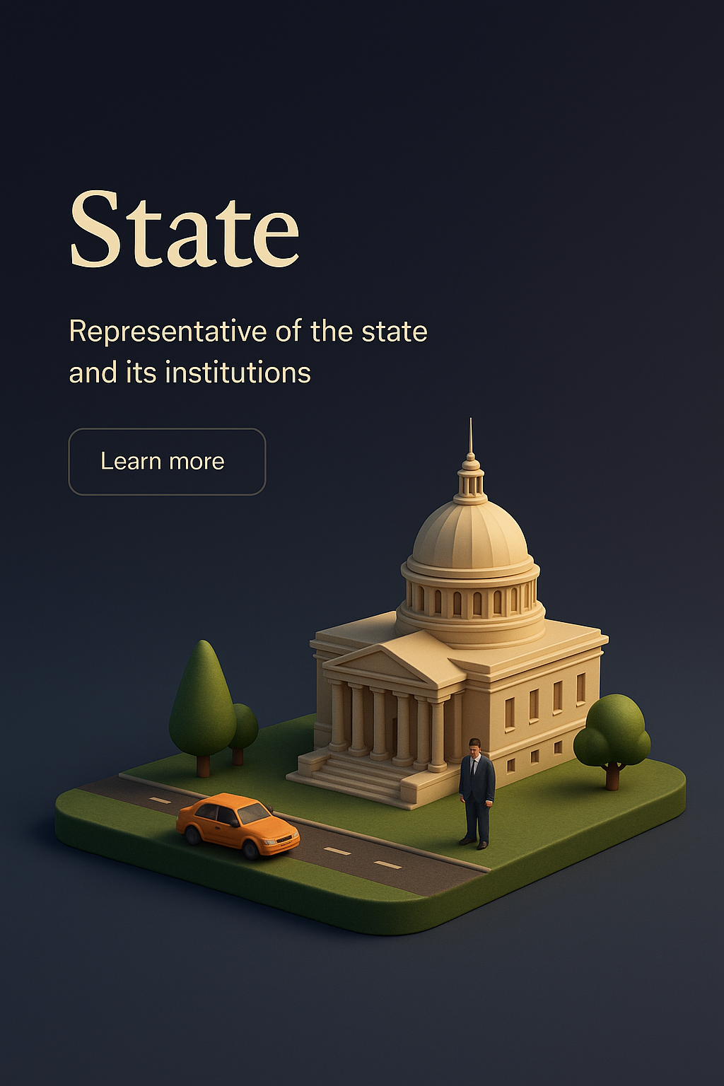 A minimalist 3D illustration showcasing a small state building with a figure and an orange car on a dark gradient background. The scene emphasizes realism and a zoomed-out perspective.