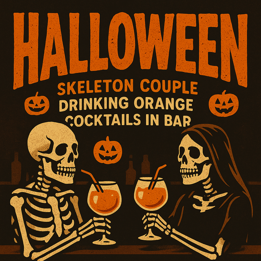 /Collection: /by davooda/Type: PNG/A vibrant Halloween illustration featuring a skeleton couple clinking glasses of orange cocktails in a bar setting, perfect for festive promotions or themed events.