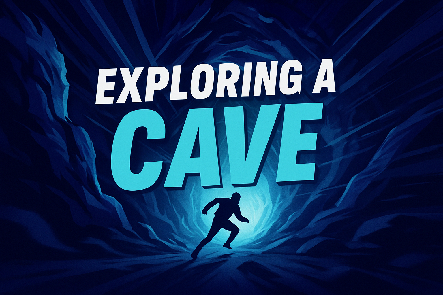 A vibrant and dynamic illustration of a person running in a cave, with bold text emphasizing the word 'CAVE'. The artwork features deep blues and contrasting colors, creating a sense of adventure.