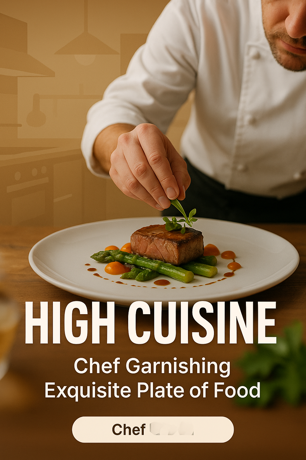 A visually appealing image depicting a chef meticulously garnishing an exquisite plate of high cuisine. Ideal for culinary blogs or restaurant marketing.