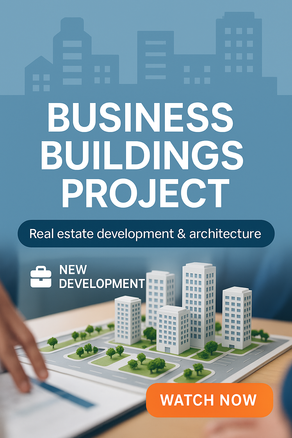 Promotional graphic for a business buildings project, featuring a model of urban architecture. Ideal for real estate marketing and advertisement.